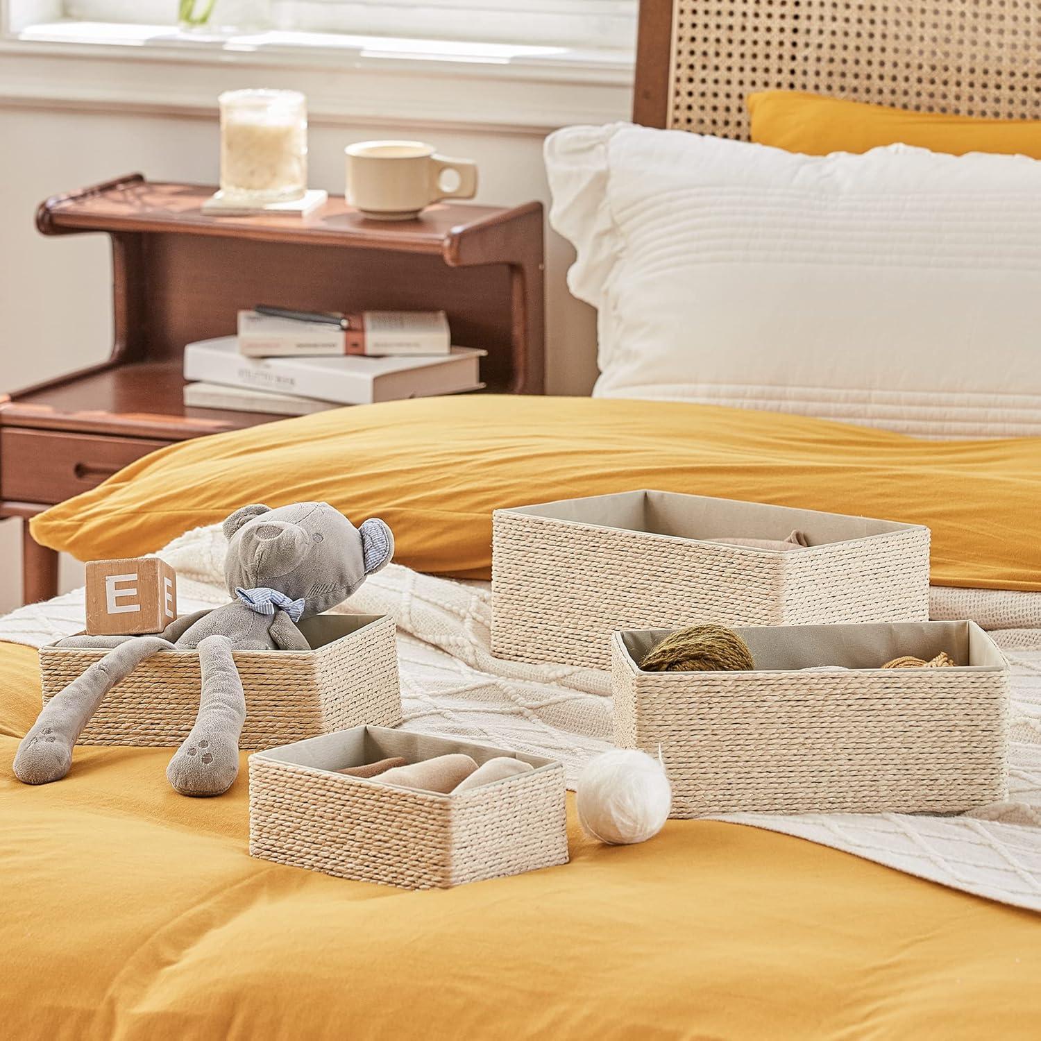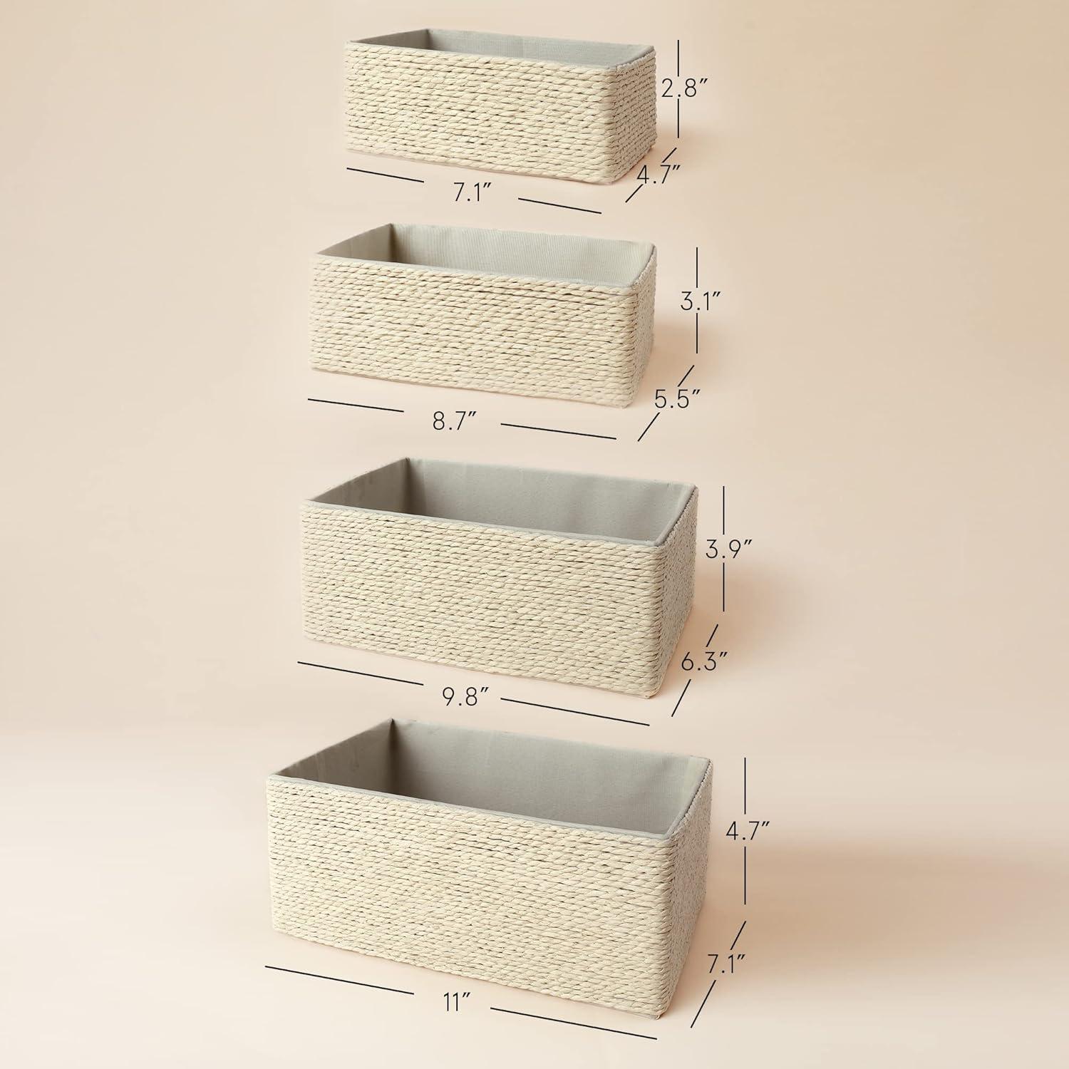 VERSATILE STORAGE: Available in four distinct sizes, this unique set caters to all your organizational needs. Use the larger baskets for towels and the smaller ones to neatly arrange cosmetics, hair accessories, office supplies, and other essentials